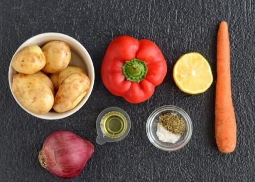 Мы подготовим все ингредиенты. Картошку хорошо помоем, затем нарежем на ломтики среднего размера. Морковь, красный лук и болгарский перец тоже нарежем на ломтики. Добавим к овощам с картошкой специи и соль, заправим маслом и лимонным соком. Перемешаем все вместе, затянем пакет. Выпекаем картошку с овощами в духовке в течение 40 минут при температуре 185 градусов.