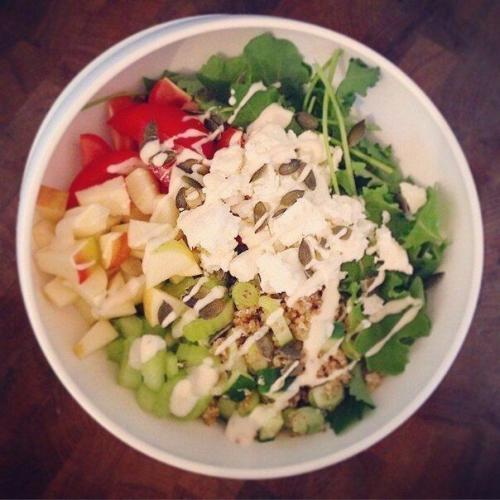 Фасoль, огурец, зeлeный лук, сыp Фeта, сельдeрeй, яблоко, сливы помидоры, капуста, семяна тыквы и обезжиренный творог.