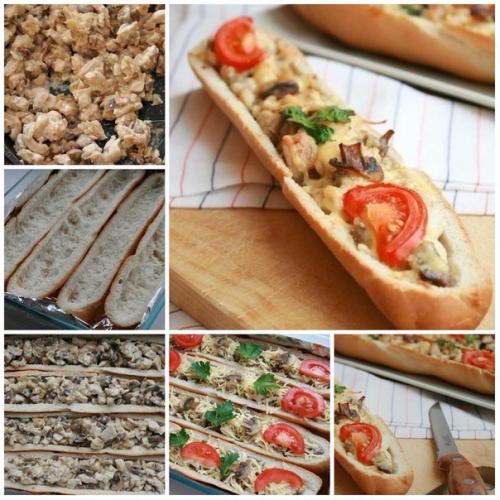 Мелко нарезаем курочку, грибы и лук, обжариваем их до готовности с использованием растительного масла, солим, перчим, добавляем сметану, мы доводим до кипения. Снимаем с огня. Багет разрезаем пополам вдоль, вынимаем из него мякиш.