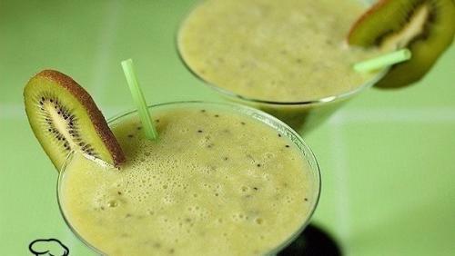 2. киви очистить от кожуры, разрезать пополам. Сложить в блендер киви, апельсиновый сок, йогурт и мед. Взбить до однородной массы.